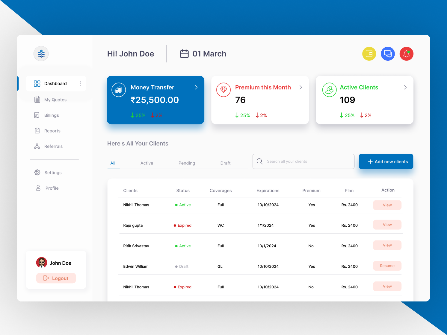 I Recently I am working on an Health Insurance Agent Dashboard, Here is a sneak pick from that.